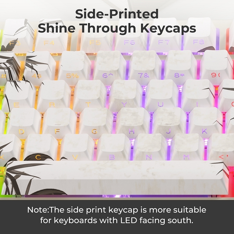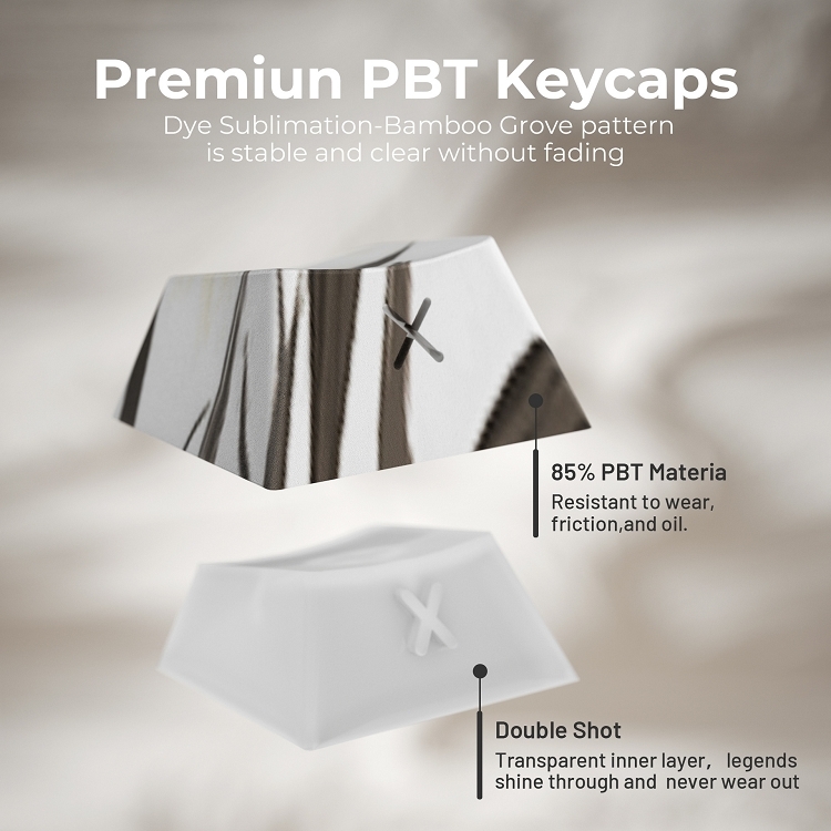 這些鍵帽由 PBT bouble bhot 製成. 與abs材質相比,pbt耐磨,耐熱,耐髒,不掉色,可用水清洗,為您提供更好舒適的體驗。