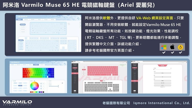 阿米洛提供軟體外,更提供自研 VA-Web 網頁設定頁面,只要開啟瀏覽器,不用安裝軟體,就能設定Varmilo Muse 65 HE電競磁軸鍵盤所有功能。如按鍵功能、燈光效果、性能調校(RT、DKS、MT、TGL等)、更新韌體都能進行手動調整,提供繁體中文介面。
