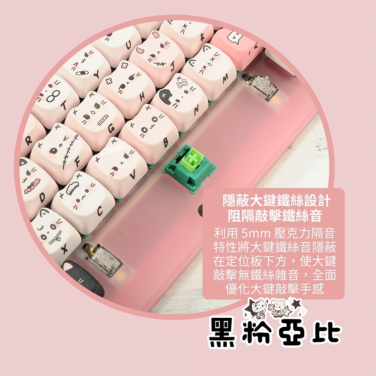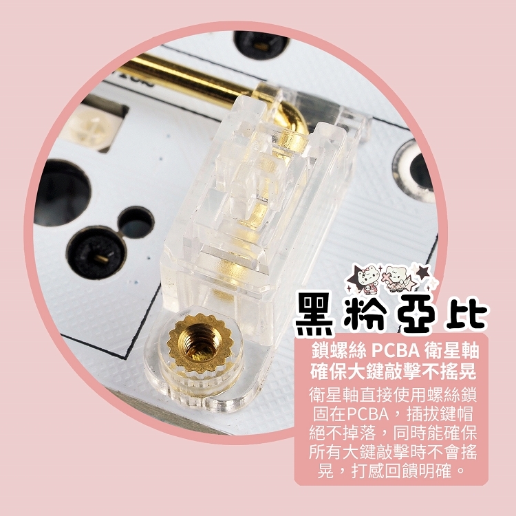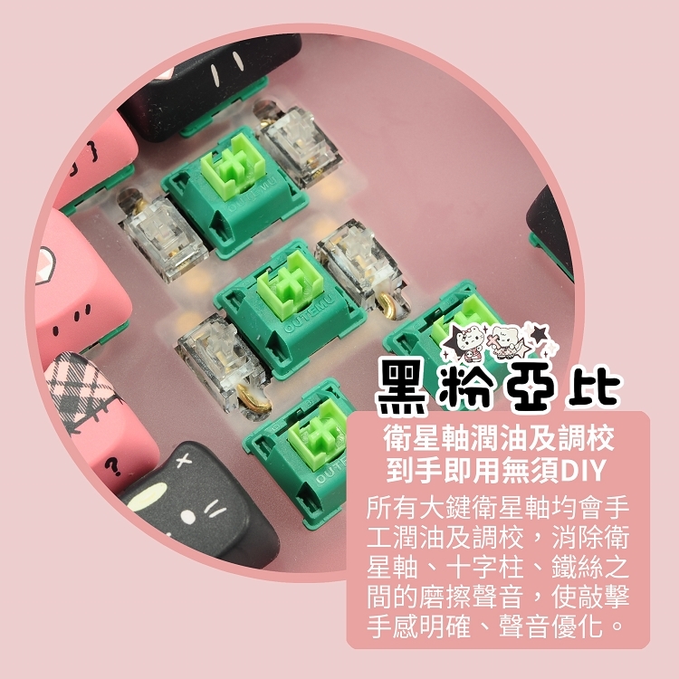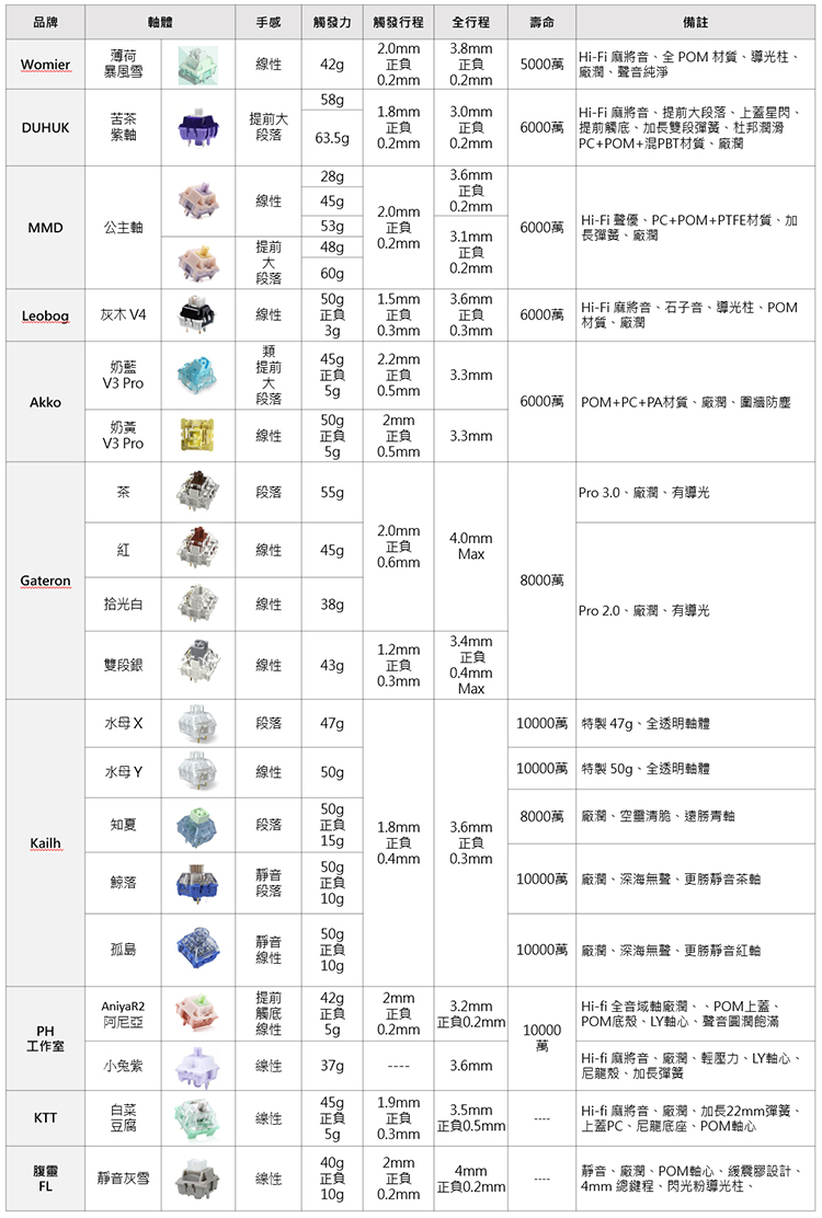 Outemu 春風(1.5mm+-0.05mm 精準的快觸發)、佳達隆 G Pro 2.0 雙段銀軸(1.2mm+-0.3mm 可最快觸發)。【喜歡 用力打字 那就打造重手鍵盤 推薦 重力四選 】MMD 公主段落60g、MMD 公主線性53g、Duhuk 苦茶紫 V2 58g 或 63.5g。【喜歡 輕輕打字 那就打造輕手鍵盤 推薦 輕靈五選 】MMD 公主線性28g、佳達隆 G Pro 2.0 時光白 38g、小兔紫 38g、Outemu 鴨梨(輕壓力)。【喜歡 傳統手感 那就打造中規中矩 標準兩選 】佳達隆 G Pro 3.0 茶軸、佳達隆 G Pro 2.0 紅軸。