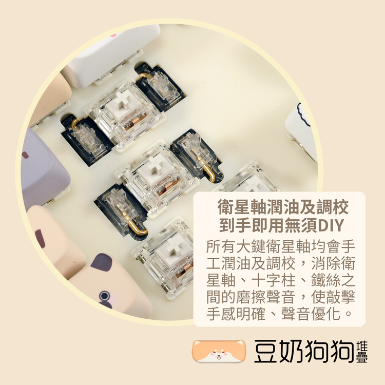 Outemu 春風(1.5mm+-0.05mm 精準的快觸發)、佳達隆 G Pro 2.0 雙段銀軸(1.2mm+-0.3mm 可最快觸發)。【喜歡 用力打字 那就打造重手鍵盤 推薦 重力四選 】MMD 公主段落60g、MMD 公主線性53g、Duhuk 苦茶紫 V2 58g 或 63.5g。【喜歡 輕輕打字 那就打造輕手鍵盤 推薦 輕靈五選 】MMD 公主線性28g、佳達隆 G Pro 2.0 時光白 38g、小兔紫 38g、Outemu 鴨梨(輕壓力)。【喜歡 傳統手感 那就打造中規中矩 標準兩選 】佳達隆 G Pro 3.0 茶軸、佳達隆 G Pro 2.0 紅軸。